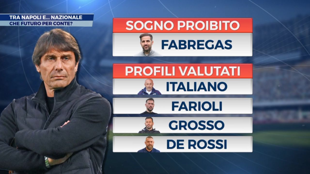 "Il Napoli si sta muovendo, sta sondando dei profili che devono rispondere a determinate caratteristiche. Il sogno proibito è Fabgreas. Gli altri profili valutati sono Italiano, Farioli, Grosso e De Rossi nel caso in cui Conte accettasse la Nazionale".