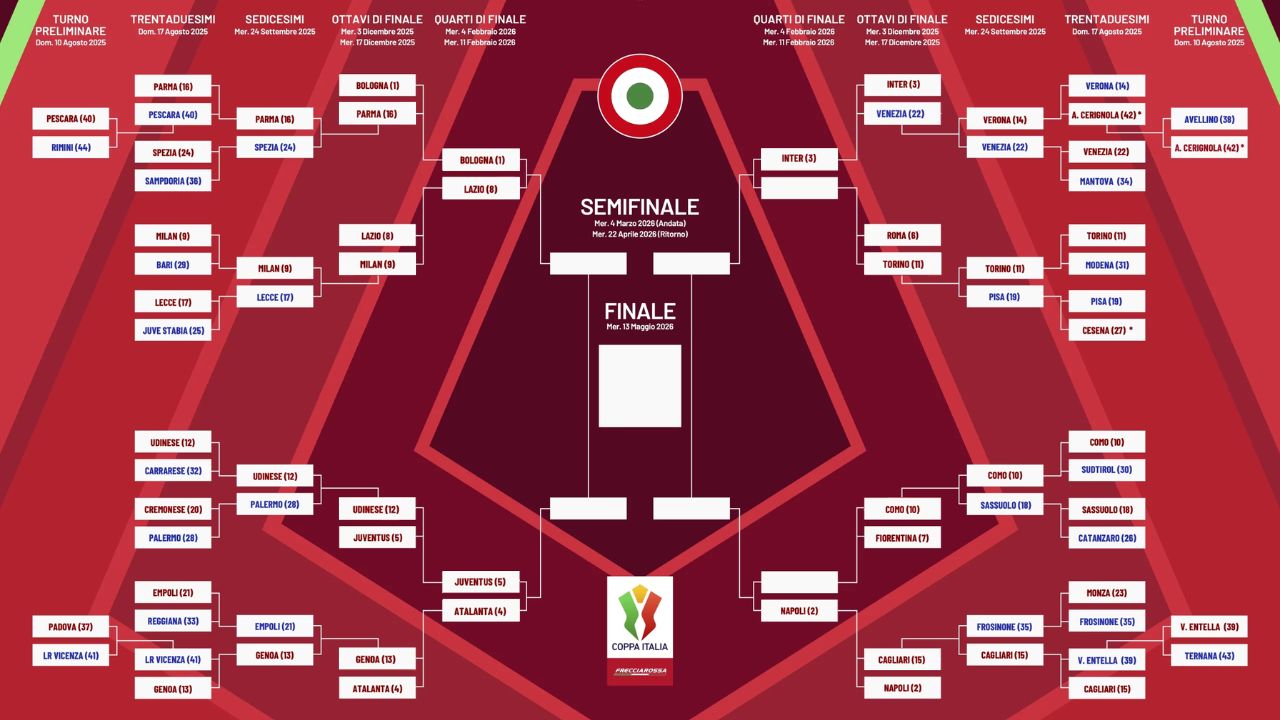 Tabellone Coppa Italia 25 26, tutte le partite con il calendario Coppa Italia aggiornato per la nuova competizione italiana che è partita. Scopriamo insieme date e orari del tabellone Coppa Italia.