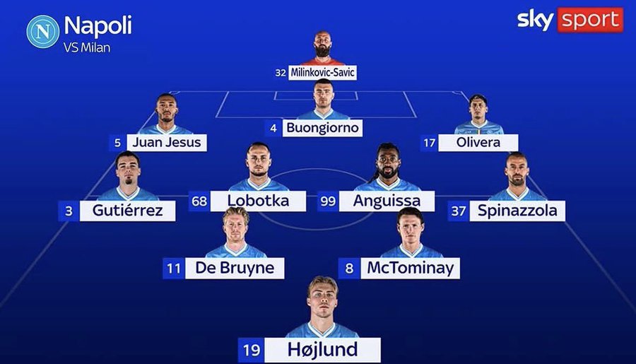 - NAPOLI (3-4-2-1) la probabile formazione: Milinkovic-Savic; Juan Jesus, Buongiorno, Olivera; Gutierrez, Lobotka, Anguissa, Spinazzola; De Bruyne, McTominay; Hojlund. All. Conte