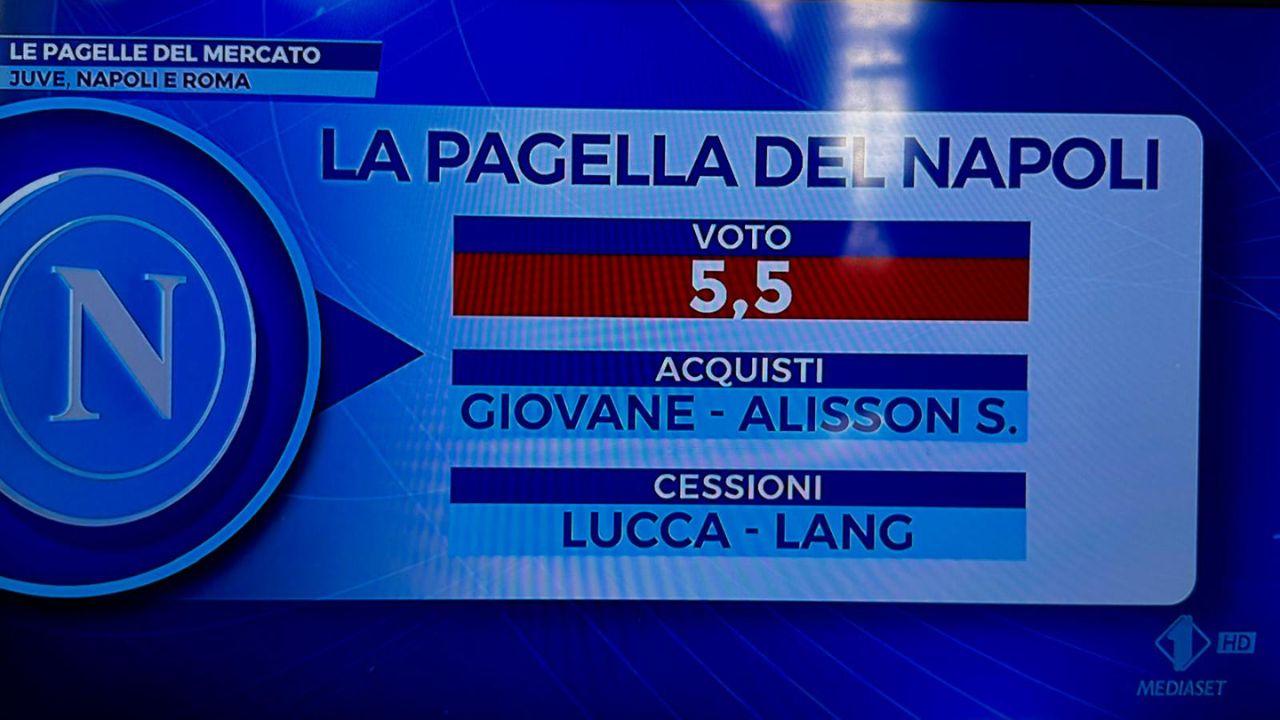 Voto 5,5 alla SSC Napoli, motivato così: "Antonio Conte ne avrebbe acquistati quattro o cinque, viste le defezioni causate dagli infortuni. Gliene hanno preso uno, ma davvero buono: Giovane del Verona. Un attaccante eclettico che può dare un contributo importante. Certo che l’infortunio del capitano Di Lorenzo poteva suggerire un acquisto sulla fascia destra, invece De Laurentiis non ha trovato un profilo all’altezza del Napoli. Arriva con ottime prospettive Alisson Santos, colpo azzurro dell'ultimo giorno, dallo Sporting Lisbona. Forse non era una primissima scelta ma potrebbe rappresentare una gradita sorpresa. Le cessioni di Lucca e Lang sono state ammissioni di colpa, in estate non si è puntato sui giocatori davvero funzionali".