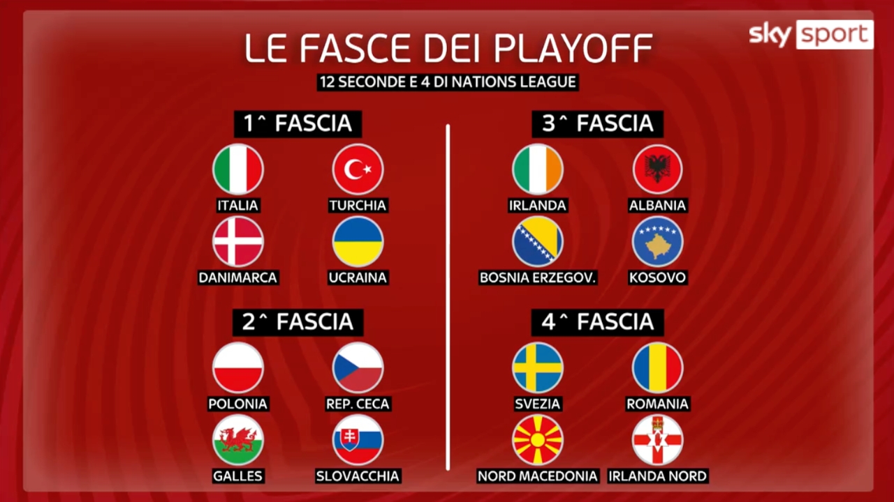 ?L'appuntamento per il sorteggio playoff è a Zurigo il 20 novembre 2025, dove alle ore 13:00: andrà in scena il sorteggio del percorso che attenderà gli azzurri ai playoff. Ma come funzioneranno i sorteggi di giovedì? Le 16 squadre saranno distribuite in 4 pot differenti da quattro squadre ciascuno: le "ripescate" dalla Nations League andranno direttamente nella quarta fascia, mentre le restanti 12 andranno a comporre le prime tre fasce a seconda del ranking Fifa di novembre, aggiornato dopo i risultati delle ultime partite: l'Italia partirà dalla prima fascia e nessuna nazionale potrà affrontarne un'altra della stessa fascia.