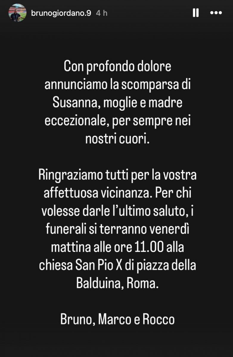 "Con profondo dolore annunciamo la scomparsa di Susanna, moglie e madre eccezionale, per sempre nei nostri cuori. Ringraziamo tutti per la vostra affettuosa vicinanza. Per chi volesse darle l'ultimo saluto, i funerali si terranno venerdì mattina alle ore 11.00 alla chiesa San Pio X di piazza della Balduina, Roma.