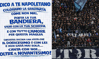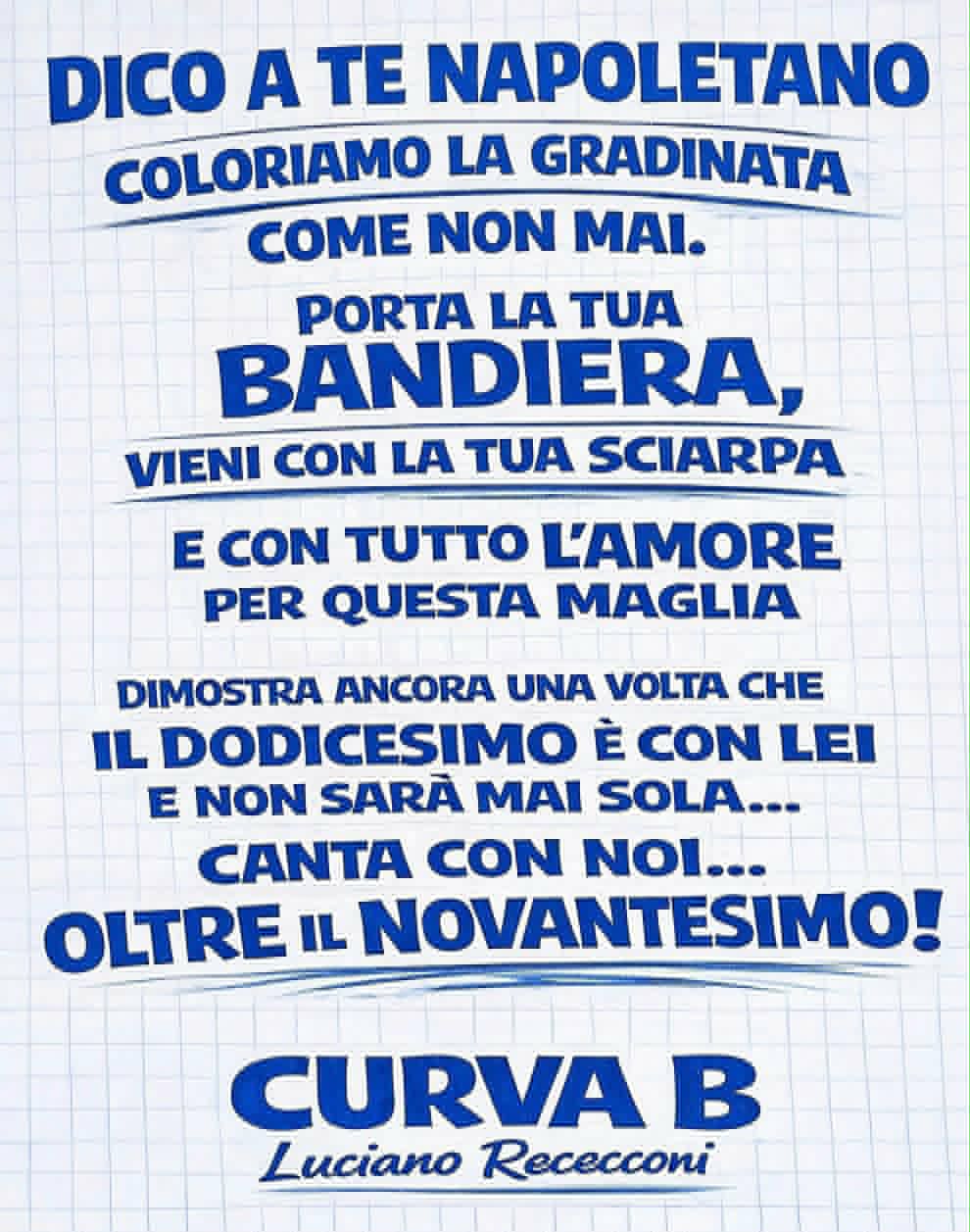 “Dico a te napoletano, coloriamo la gradinata come non mai. Porta la tua bandiera, vieni con la tua sciarpa e con tutto l’amore per questa maglia. Dimostra ancora una volta che il dodicesimo è con lei e non sarà mai sola..Canta con noi…Oltre il novantesimo! Curva B Luciano Rececconi”.