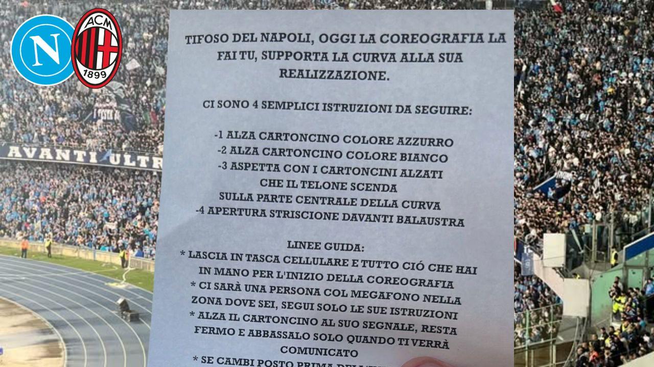 Volantino della Curva A in occasione di Napoli-Milan. Gli ultras napoletani hanno organizzato una coreografia per la partita del big match di Serie A che si gioca stasera ore 20:45 allo stadio Diego Armando Maradona. Prima del fischio d'inizio, è stato diffuso un volantino che contiene le istruzioni da seguire per partecipare alla coreografia e le linee guida da rispettare.