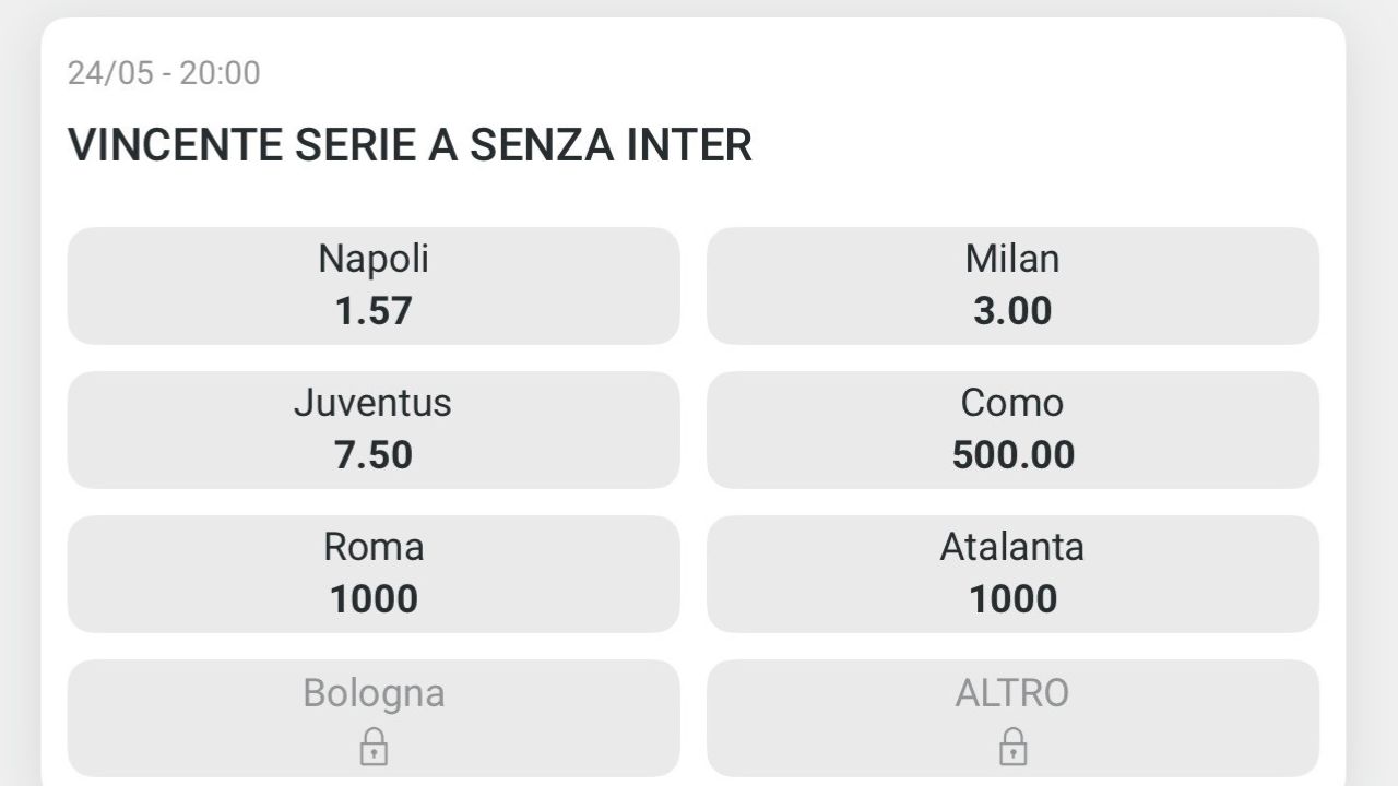 Ultime notizie calcio. Prima della 34^ giornata di Serie A, alcuni bookmakers come Sisal hanno aggiornato le quote per chi si prenderà il nuovo titolo di campioni d’Italia. Dopo il potenziale +12 per l’Inter e la sconfitta del Napoli con la Lazio, le varie agenzie hanno introdotto nei palinsesti una nuova scommessa: “Vincente campionato senza Inter”.