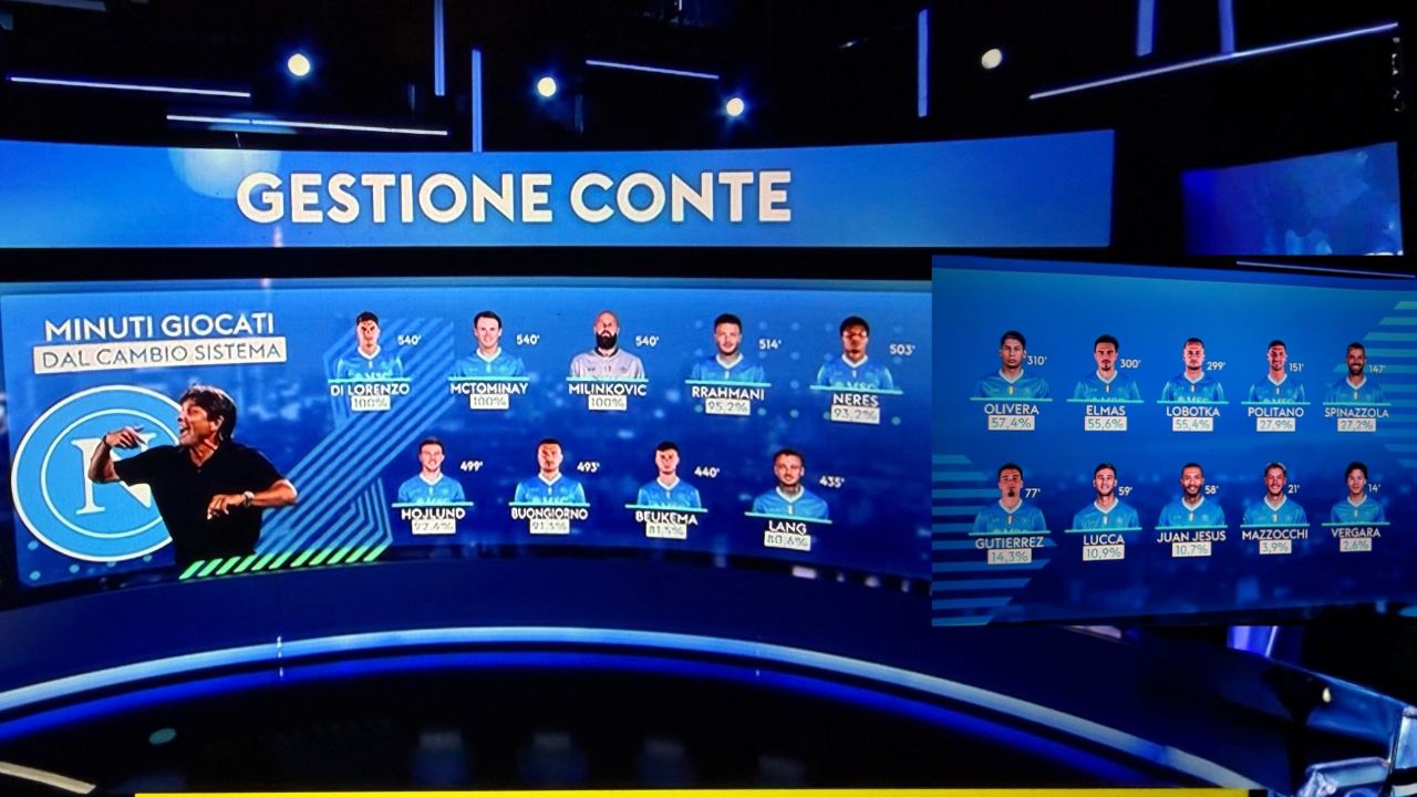 Mentre riguardo lo scarso turnover dal passaggio al 3-4-3, ecco i numeri mostrati da Sky che evidenziano come per molti il minutaggio sia ben oltre il 90% dei minuti giocati: