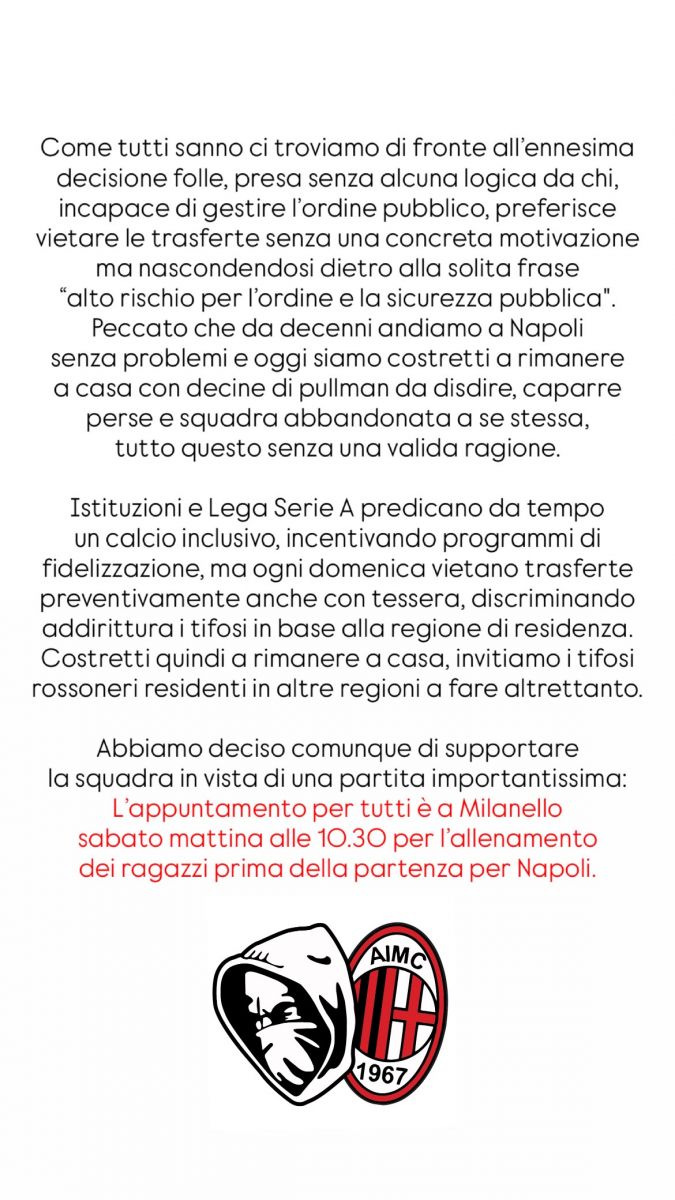"Come tutti sanno ci troviamo di fronte all'ennesima decisione folle, presa senza alcuna logica da chi, incapace di gestire l'ordine pubblico, preferisce vietare le trasferte senza una concreta motivazione ma nascondendosi dietro alla solita frase "alto rischio per l'ordine e la sicurezza pubblica". Peccato che da decenni andiamo a Napoli senza problemi e oggi siamo costretti a rimanere a casa con decine di pullman da disdire, caparre perse e squadra abbandonata a se stessa, tutto questo senza una valida ragione. Istituzioni e Lega Serie A predicano da tempo un calcio inclusivo, incentivando programmi di fidelizzazione, ma ogni domenica vietano trasferte preventivamente anche con tessera, discriminando addirittura i tifosi in base alla regione di residenza. Costretti quindi a rimanere a casa, invitiamo i tifosi rossoneri residenti in altre regioni a fare altrettanto. Abbiamo deciso comunque di supportare la squadra in vista di una partita importantissima: l'appuntamento per tutti è a Milanello sabato mattina alle 10.30 per l'allenamento dei ragazzi prima della partenza per Napoli".