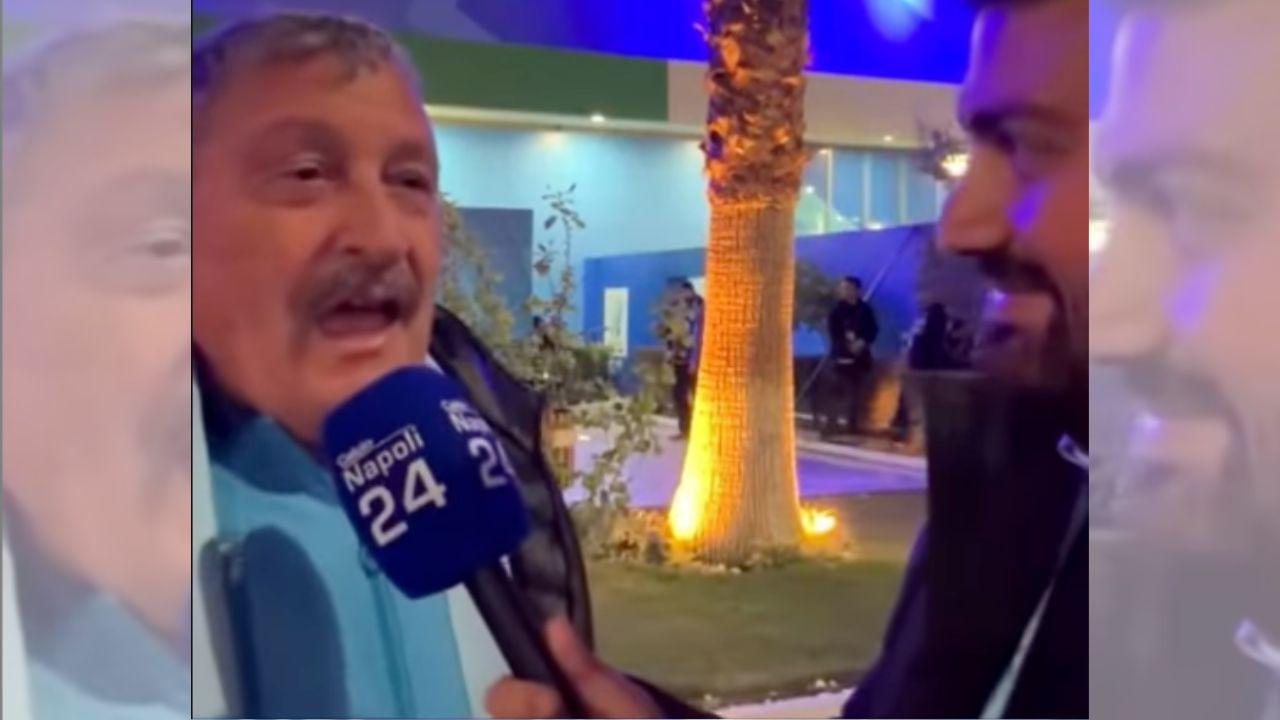 Tommaso Starace, ex magazziniere della SSC Napoli, festeggia la Supercoppa italiana 2025 in diretta su CalcioNapoli24 a Riyadh, all'esterno dello Al-Awwal Park subito dopo la vittoria contro il Bologna.